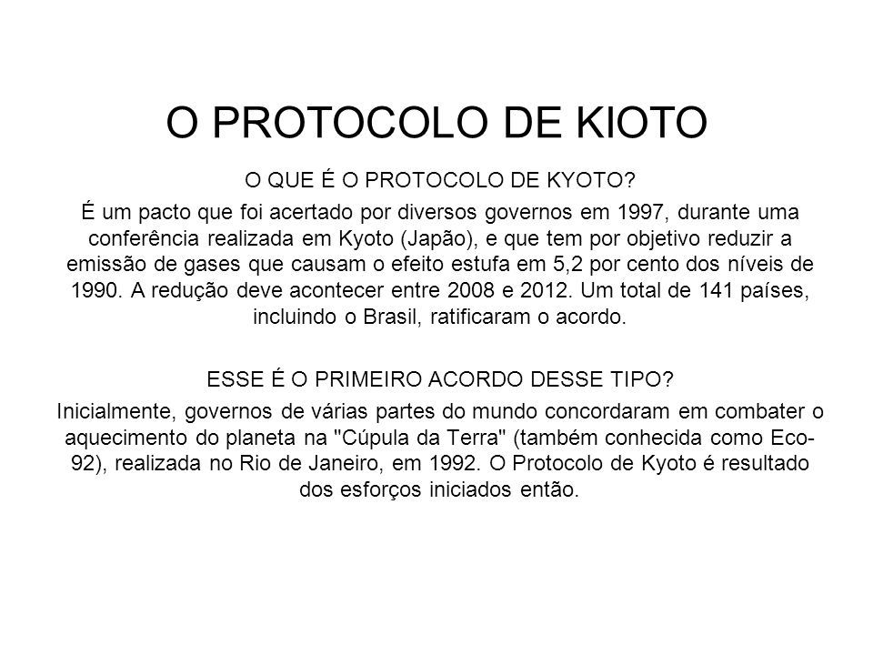 Conferência importante em relação ao aquecimento global. Idéia de redução de uma cota fixa de 5,2% dos índices de emissão de CO2.