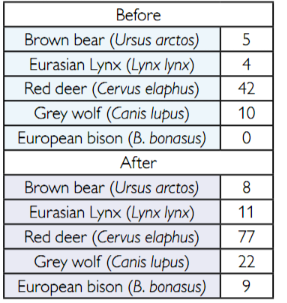 Scientists counted members of different species of mammals present in the smaller habitat before and after the introduction of the green bridge.
