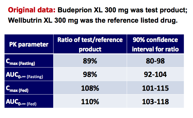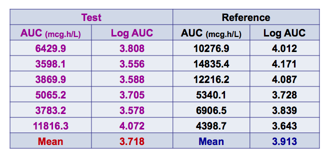 > The 90% confidence interval for the ratio of the geometric means of the test and reference products (test/reference, as a percentage) should be contained within the acceptance interval of 80-125%