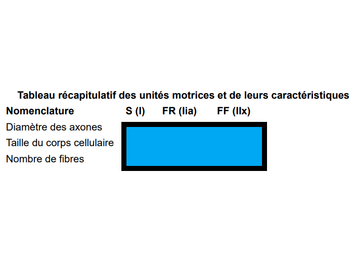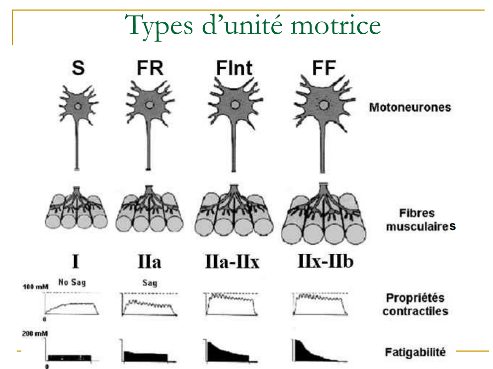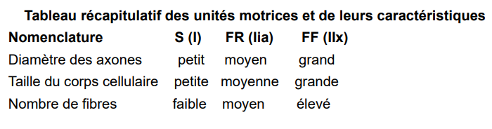 -leur type de fibres : une unité motrice ne contient qu’un seul et même type de fibres musculaires (I, IIa, IIx). Il y a donc uniformité pour la rapidité de contraction et la résistance à la fatigue;