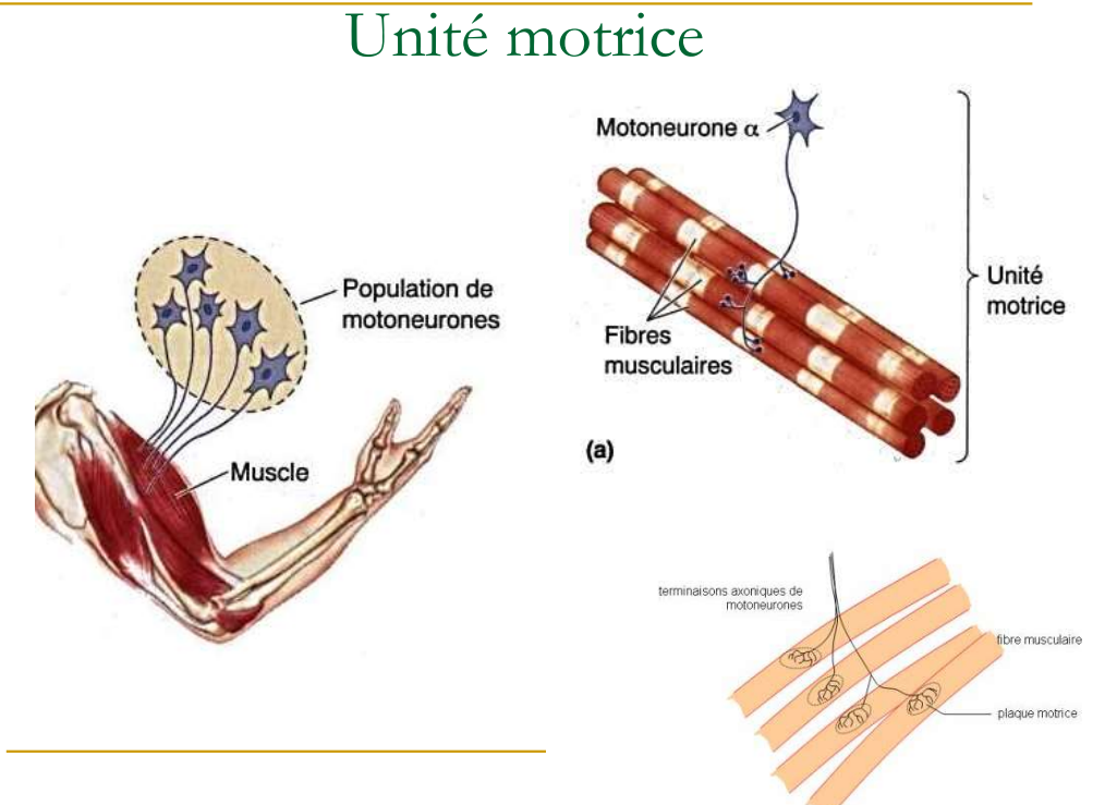De plus, lors de la stimulation électrique d’un motoneurone, toutes les fibres musculaires de l’UM sont excitées et se contractent en même temps (loi du tout ou rien)
