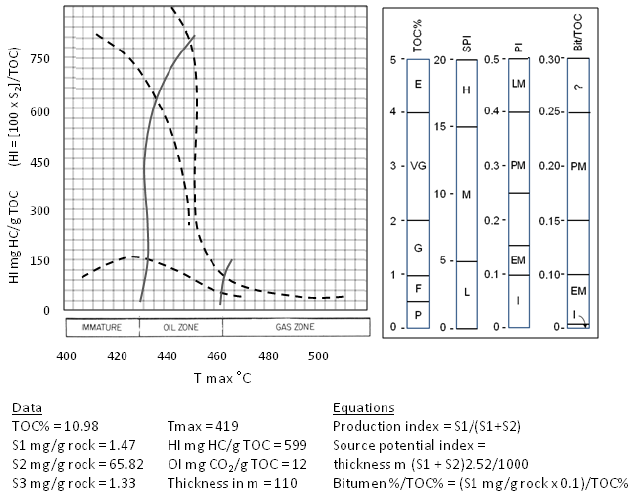 Explaining your reasoning, comment on Bitumen/TOC as a maturity indicator, commenting on whether any evidence of migrated oil exists in the sample.