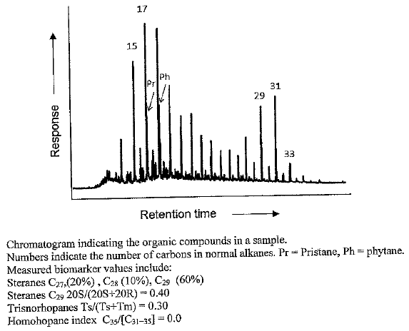Examine the chromatogram and biomarker ratios/abundances given below. Explaining your reasoning, comment on the significance of the values in the unknown sample:
