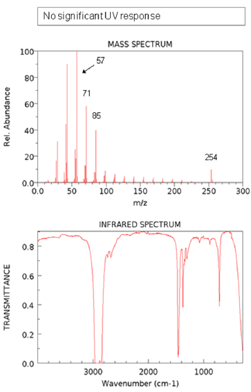 Examine the UV response, mass spectrum and IR spectrum of the unknown compound and state the molecular weight.