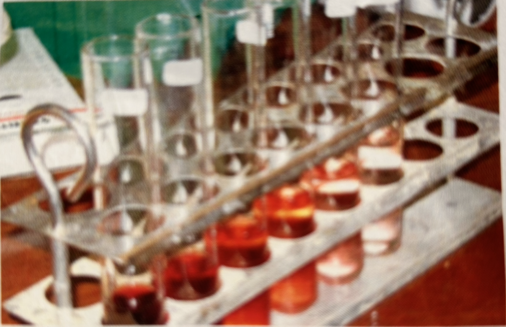 In these assay tubes the dark coloured liquid in the tube on the far left contains _______ whereas the light coloured liquid in the tube on the far right contains _______, all tubes contain 3 M NaOH.