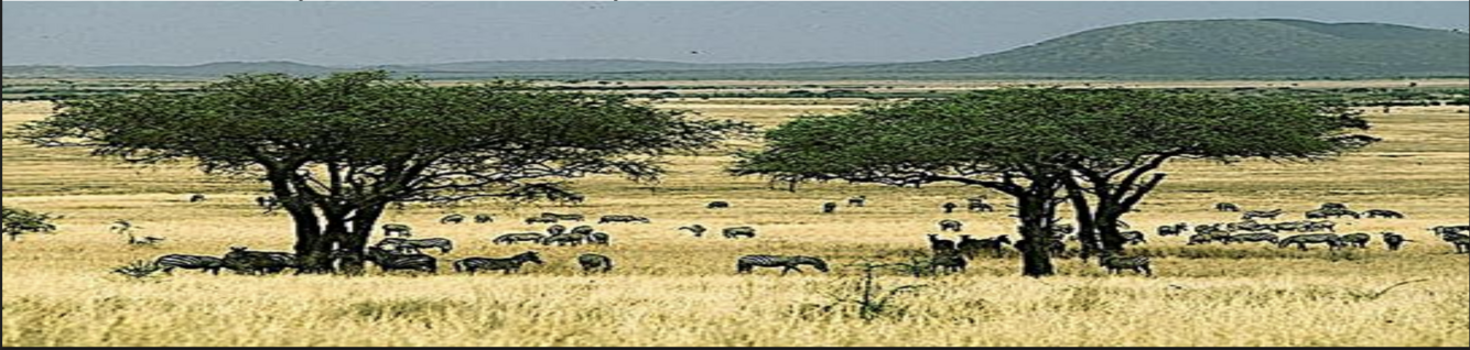 Hot and dry, dominated by grass, scrub and occasional trees