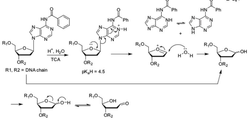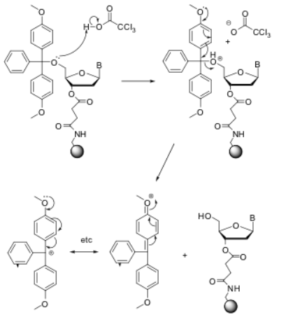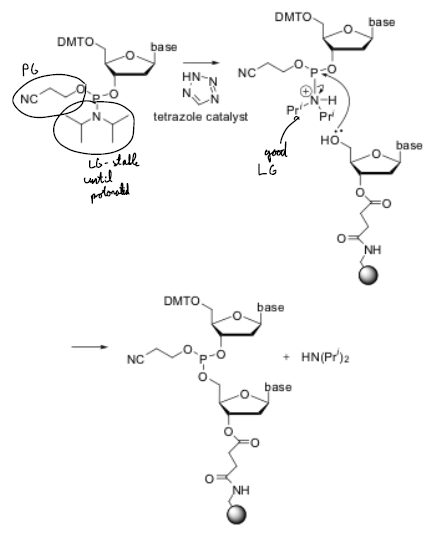 Mix of nucleoside phosphoramidites with tetrazole (weak acid) which reacts with a nucleoside on the resin