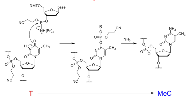 After finished, oligonucleotide cleaved from support, deprotected, & purified