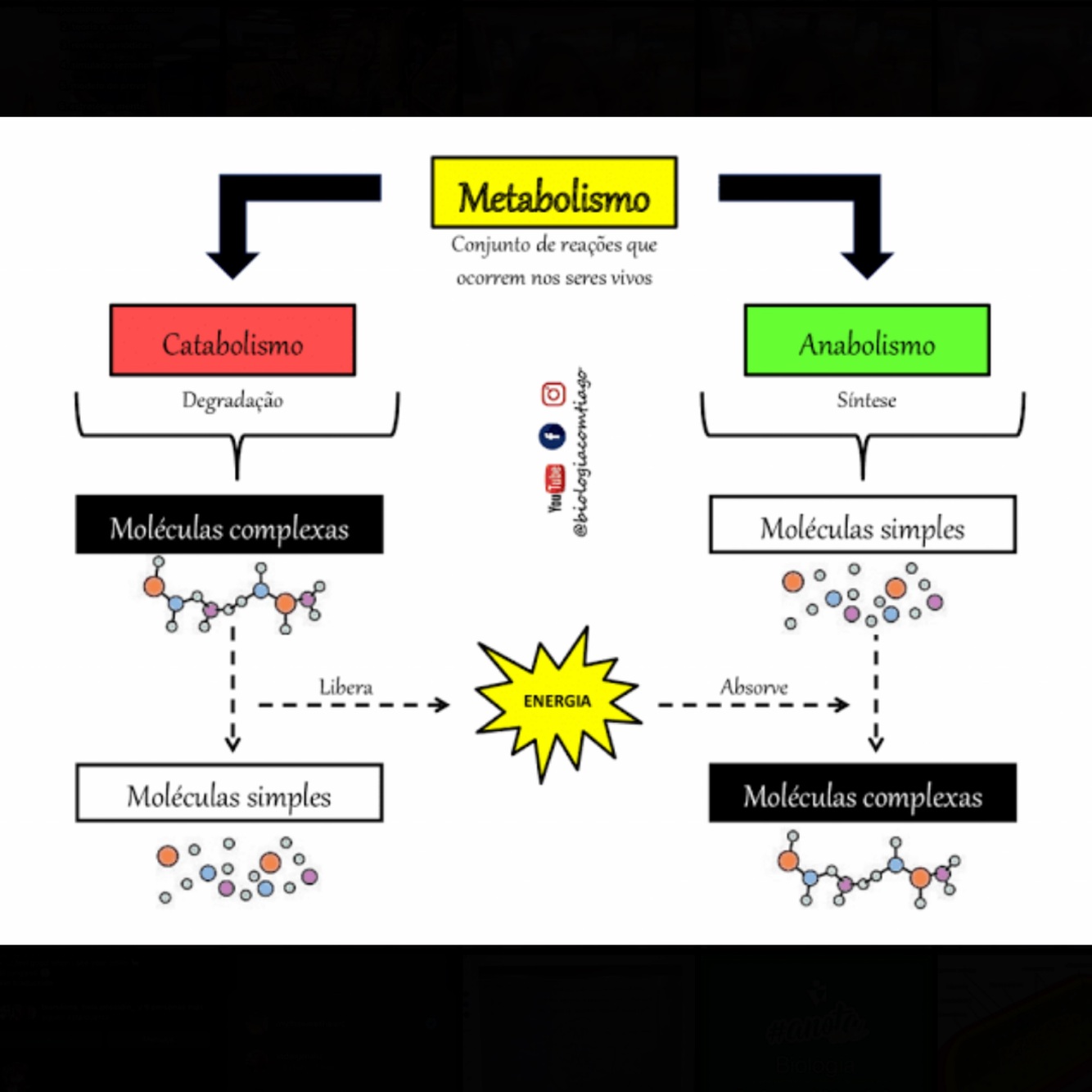 A quebra de moléculas (catabolismo) libera energia para a síntese ou montagem de outras moléculas (anabolismo).