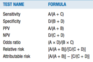 Given the 2 × 2 table below, define the formulas for calculating the following test values