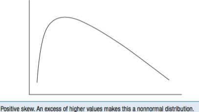 Positive skew is an asymmetric distribution with an excess of high values, in other words, the tail of the curve is on the right (mean > median > mode) (Fig. 3-2).