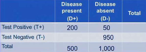 500 have the disease, 200 tested positive. 200/400 = 0.4 sensitivity. 950 didn’t have the disease and tested negative, 1000 didn’t have the disease: 950/1000 = .95 specificity. 200/250 tested positive = 0.8 positive predictive value.