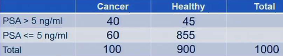 500 men with prostate cancer had PSA > 5. Of the 1000 healthy controls, 50 had PSA > 5. What is the sensitivity of this test? What is the specificity of the test? What is the positive predictive value?