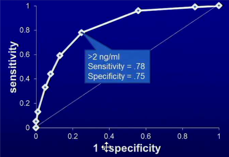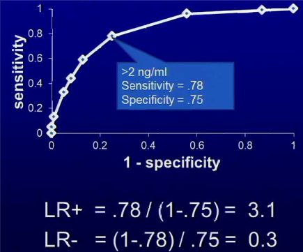 Choose a more sensitive cutoff if a missed case is really bad. Choose a more specific cutoff is a false positive is really bad. The best test would have high sensitivity and specificity w/area under the curve closer to 1 than 0.5.