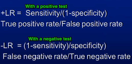 +LR = 3x more likely to have + test than those without the disease. -LR = 0.3 times more likely to have a negative test that those without the disease. You then multiply the pretest odd x LR to get post-test odds. Post-test odds are then converted back to post-test probability.