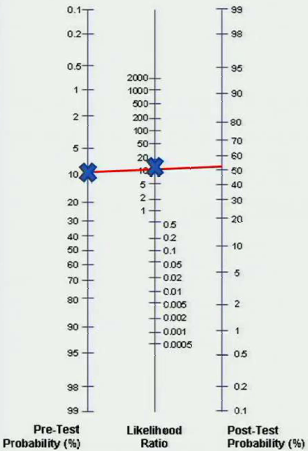 Multiply the odds on the left side by the +LR = 10:9. Turn back to prevalence (10/(10+9)) = 52%. This person started out having a 10% chance of having disease, but after his positive test he has a 52% chance of having the disease.