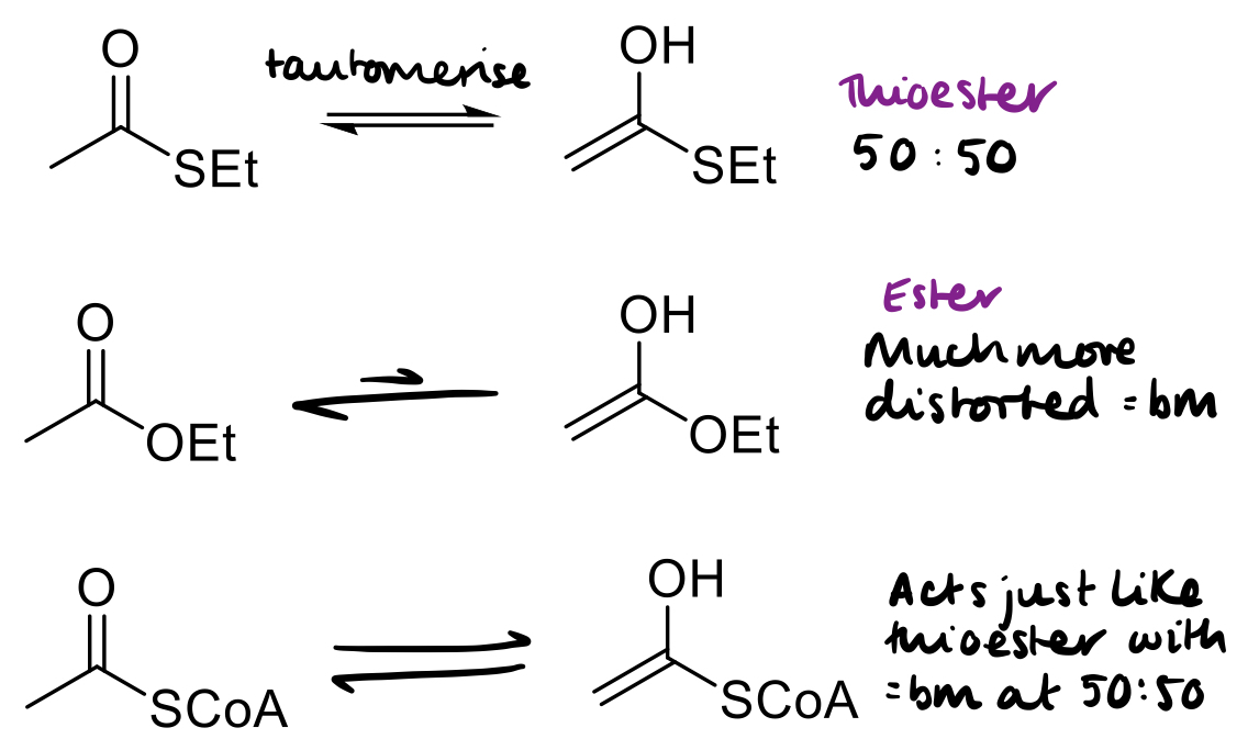 Acetyl CoA has the same reactivity as a thioester in the lab - the equilibrium is 50:50 between the keto and enol form.
