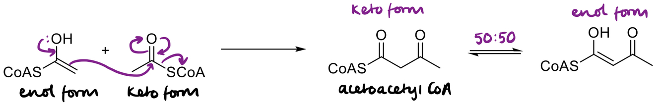 Acetyl CoA undergoes Claisen reactions in nature, where the keto and enol forms react to make acetoacetyl CoA.