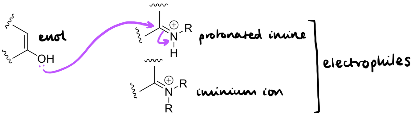 Draw curly arrows to demonstrate what the Mannich reaction is.