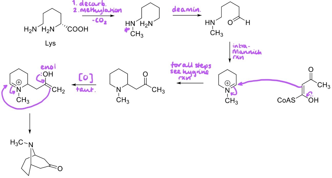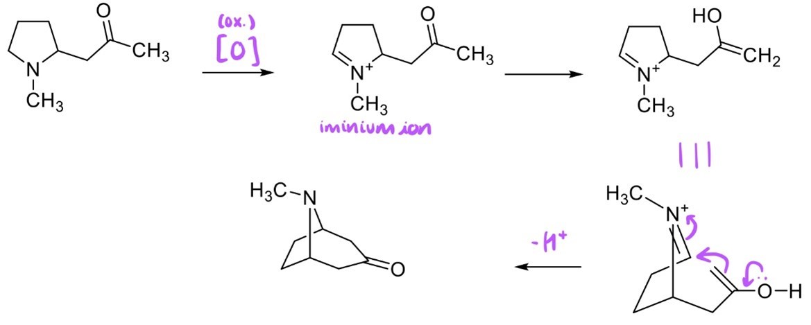 Draw the mechanism for the synthesis of tropinone from hygrine.