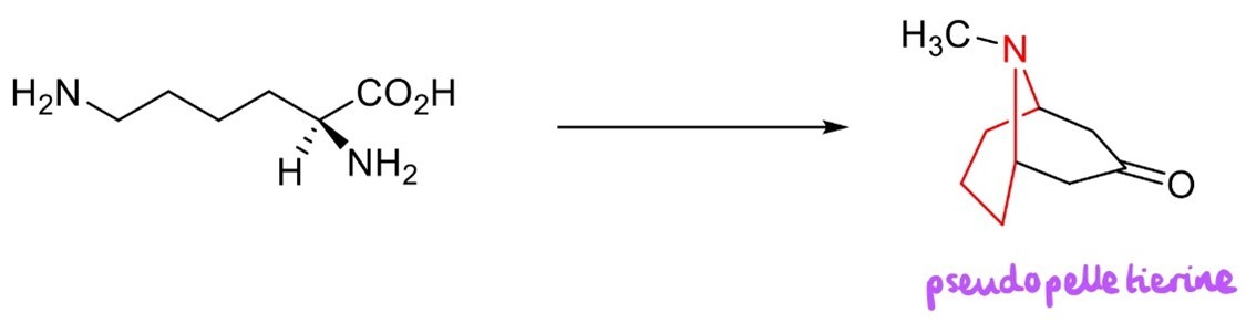 Most 6-membered rings in piperidine alkaloids come from lysine. One example is pseudopelletierine.