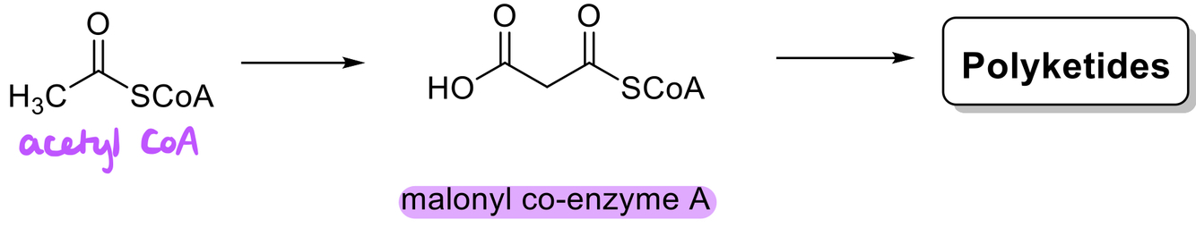 Polyketides are formed from malonyl CoA, which in turn forms from acetyl CoA.