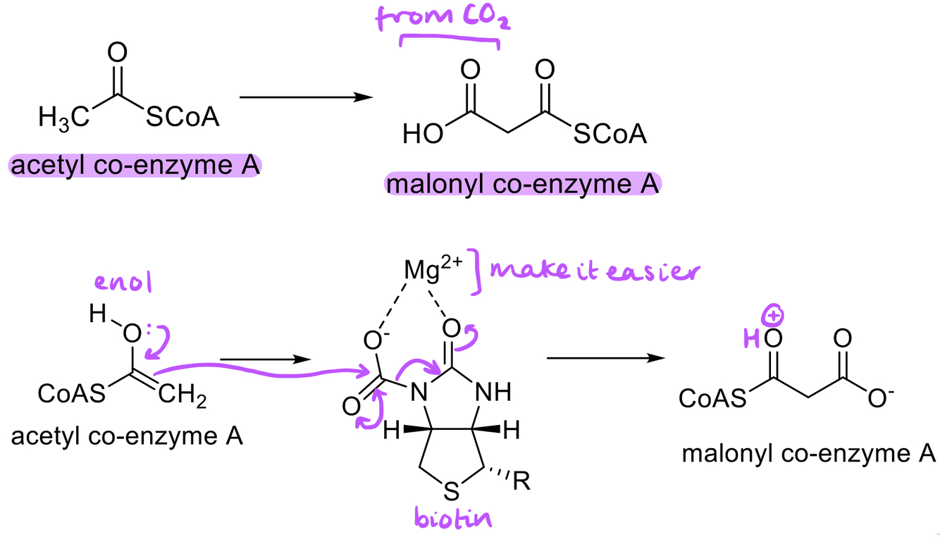 Draw the mechanism for the biosynthesis of malonyl CoA.