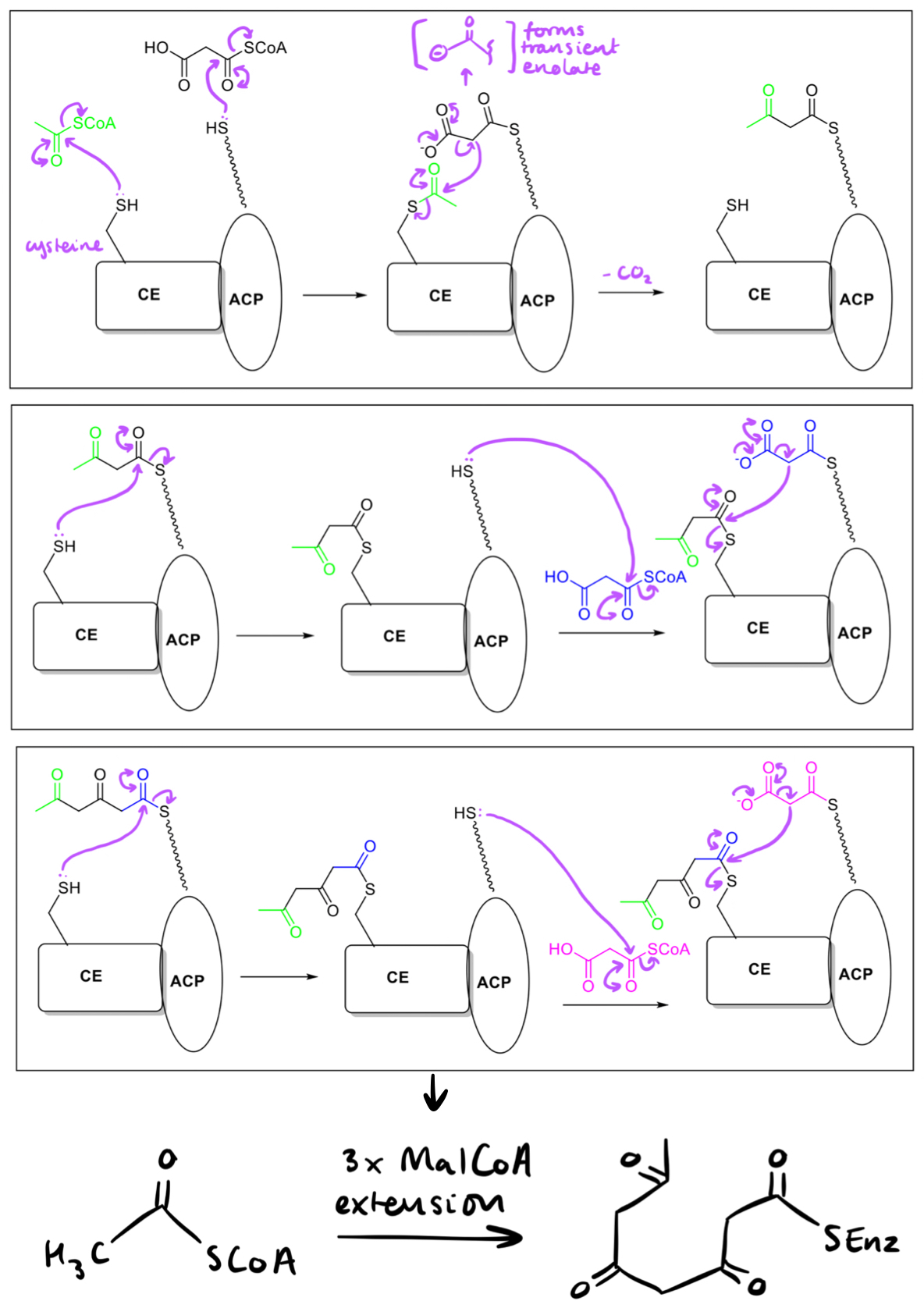 Polyketides are synthesised by a multienzyme complex containing a condensing enzyme (CE) and an acyl carrier protein (ACP).
