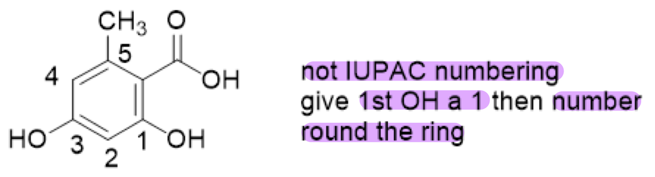 Polyketides show multiple oxygenation groups (OH or C=O) around an aromatic ring, either in a 1,3- or a 1,3,5-pattern.