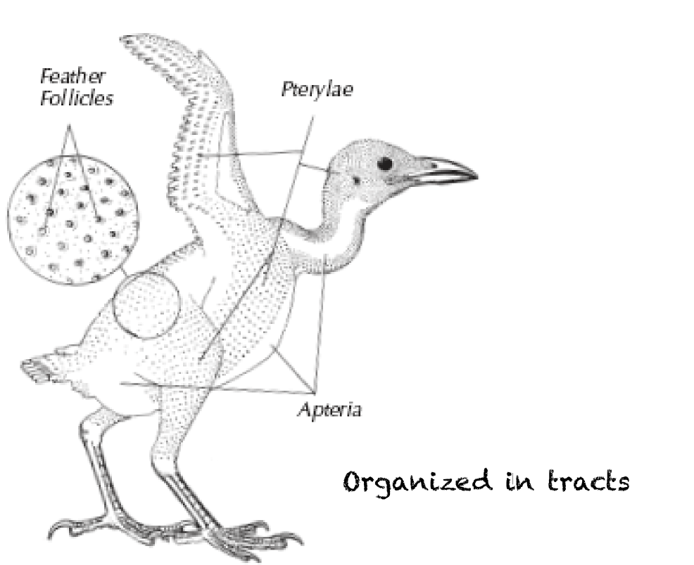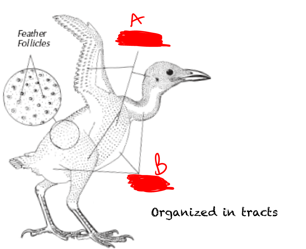 feather tracts- naked patch of skin good for jugular blood draw