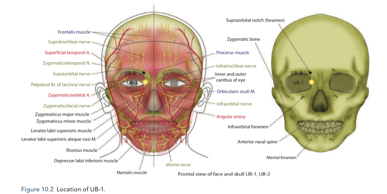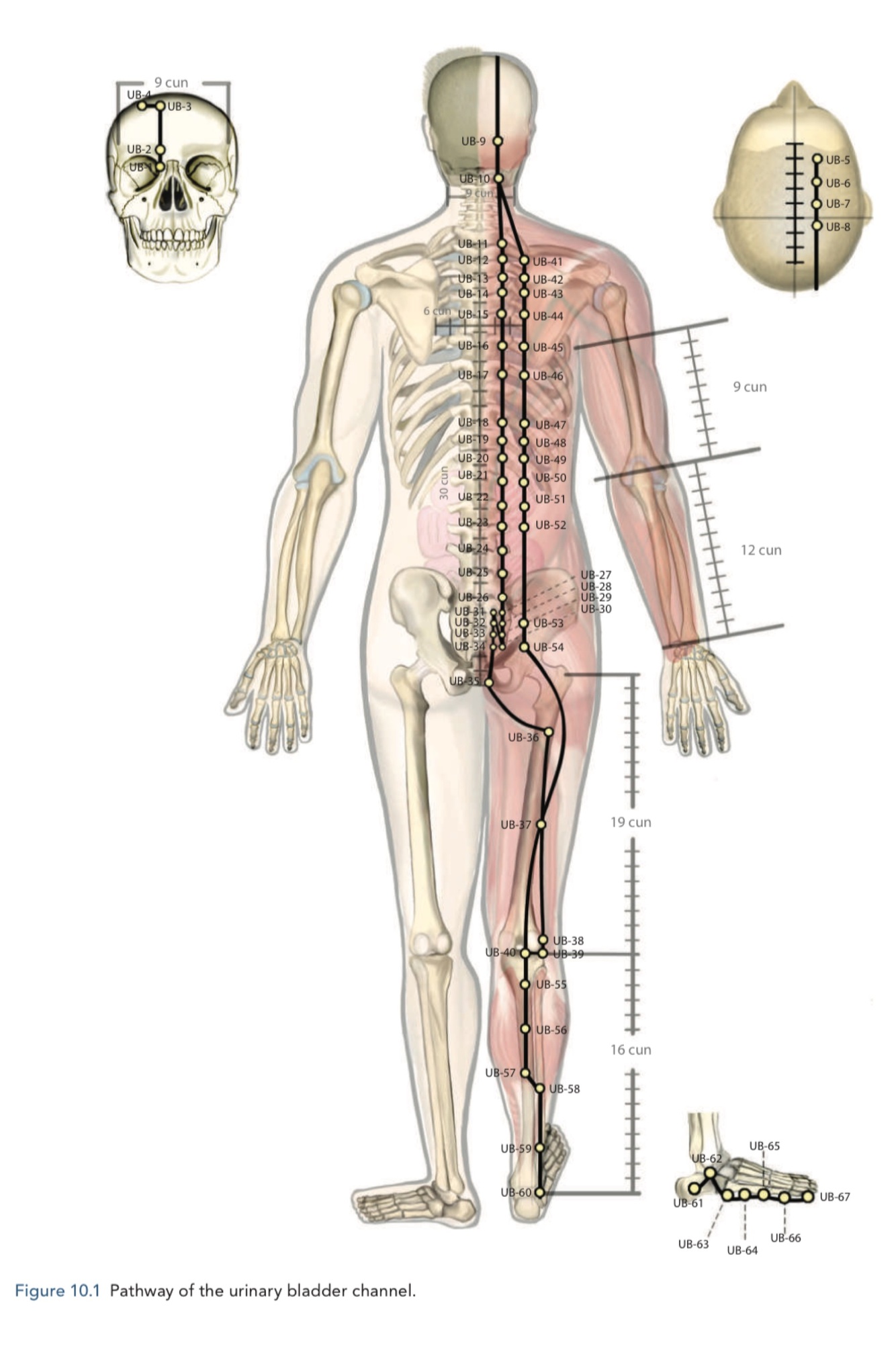 The urinary bladder channel begins from UB-1 (jing ming) at the inner canthus of the eye and then ascends to the fore- head. It continues upward where it meets up with the gov- erning vessel at DU-20 (bai hui) at the vertex of the head. It then subdivides and a branch runs into the temple.