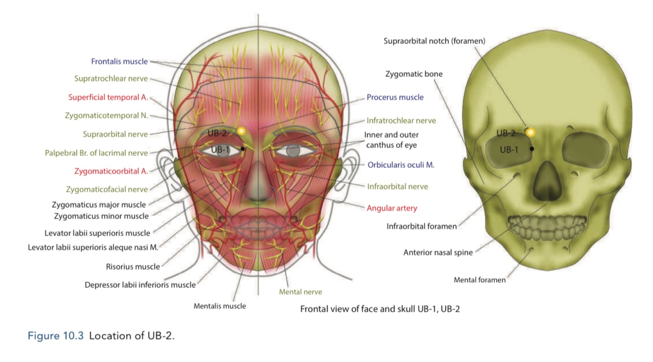 Have the patient sit or lie in the supine position. Locate the point on the forehead, on the supraorbital foramen, superior to the inner canthus. This point is located in the depression at the medial end of the eyebrow.