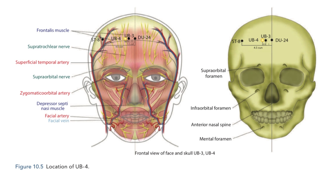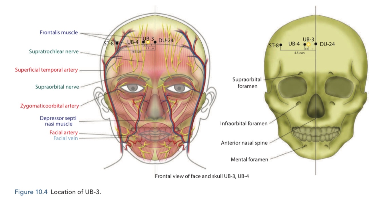 On the forehead, directly above the medial end of the eye- brow at UB-2 (zan zhu). The point is located 0.5 cun above the natural anterior hairline, midway between DU-24 (shen ting) and UB-4 (qu chai).