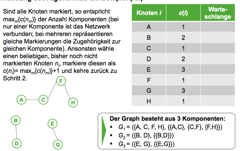 BFS Search, aber zusamenhangende bekommen die gleiche Nummer, auf Notation achten, erst alle Elemente, dann alle Verbindungen