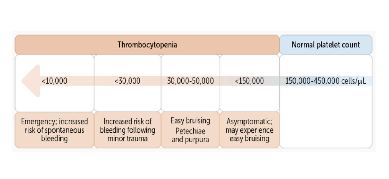 Thrombocytopenia < 10,000 platelets is associted with spontaneous bleeding