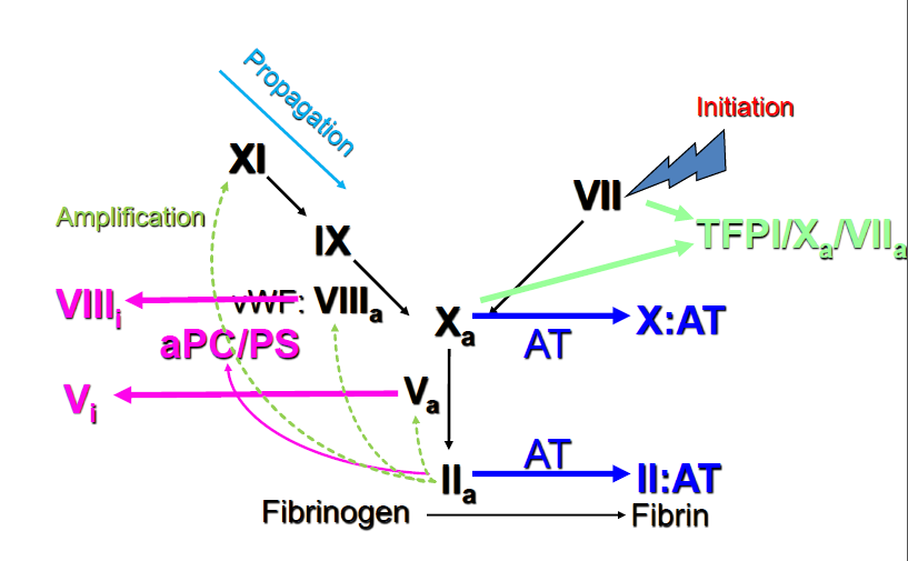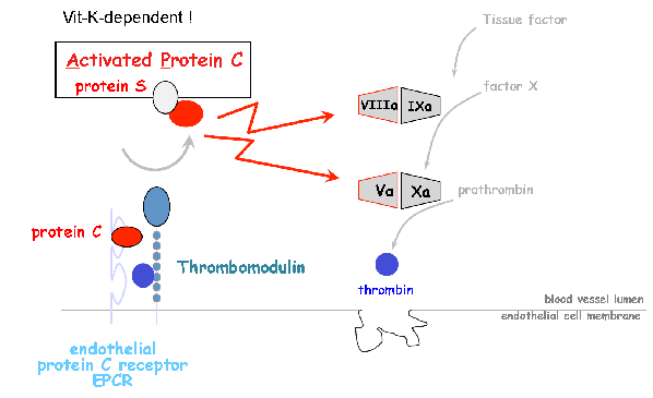 Thrombin binds to thrombomodulin ⇒ activates Protein C ⇒ Protein C degrades factors (5a and 8a)