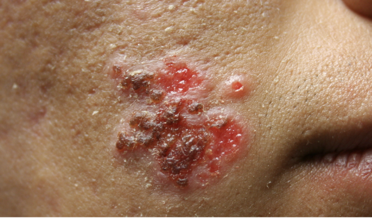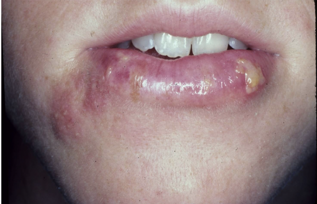 grouped vesicles on an erythematous base on the chin and lip are most likely
