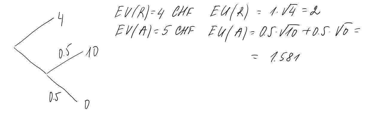 If you accept the gable your payoff looks like this (+CHF 10, 0.5; CHF 0, 0.5). If you reject, you will get CHF 4. How much is the Expected value? How much is the Expected Utility if your u(x) =Wurzel X?