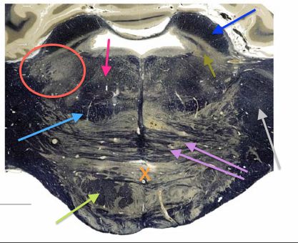 governs voluntary control of movement (corticospinal tract); comprised of upper vs. lower motor neurons, the upper motor neuron crosses the midline at level of medulla (pyramidal decussation)
