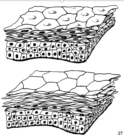 Bottom: keratinized (outer layer loses nucleus) stratified squamous epithelium