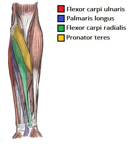 The tendons of which of the following muscles of the forearm is most vulnerable to damage in a laceration on the central palmar aspect of the rist?