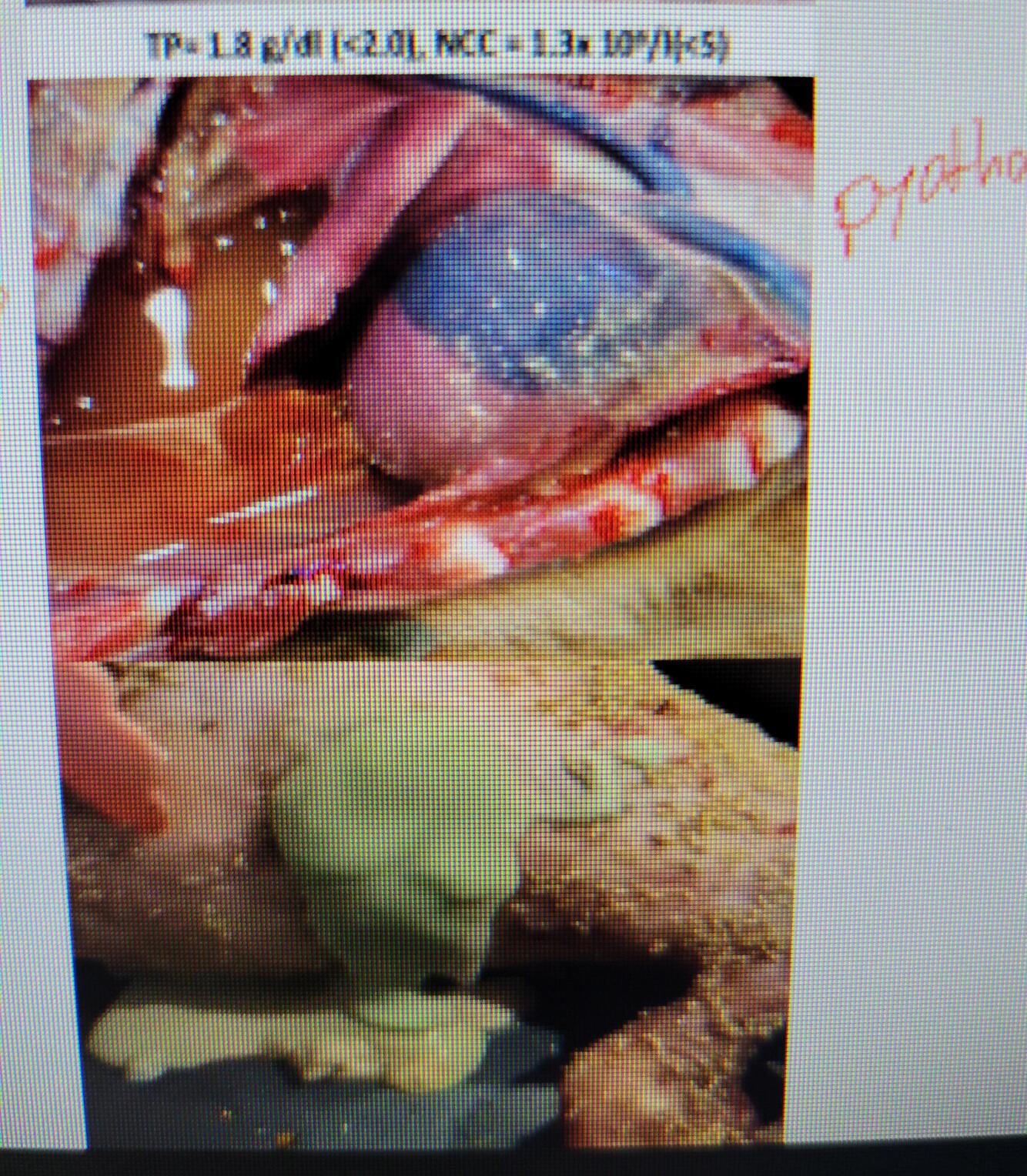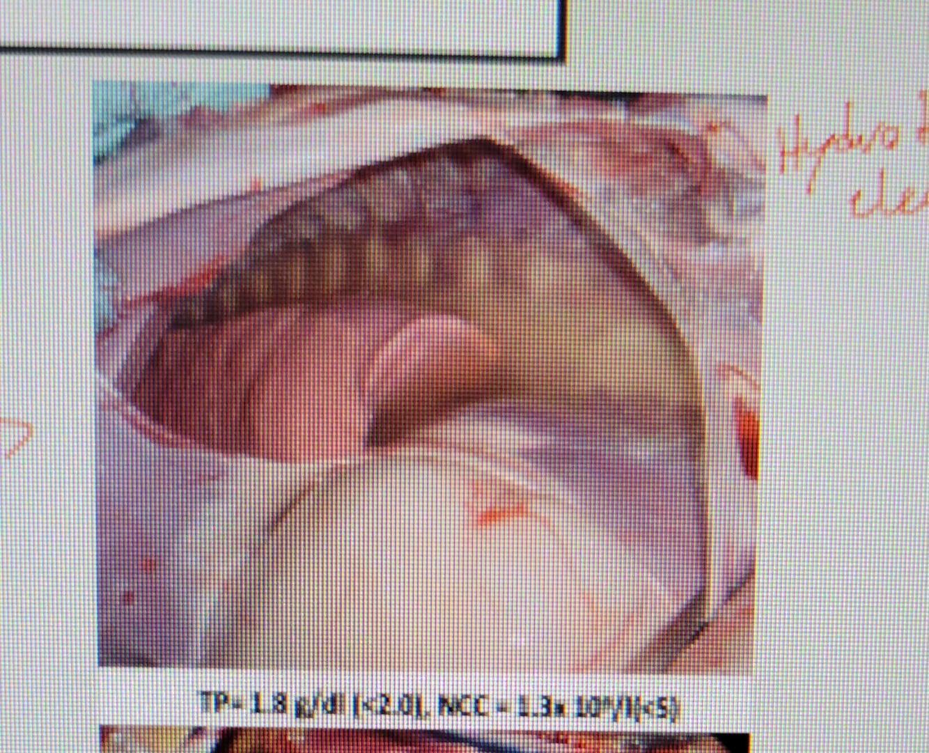 - tends to be a transudate: low protein, low specific gravity, low nucleated cell