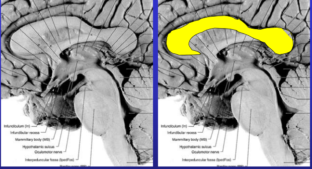 Cingulate gyrus; contains cingulum, the associational fibers that connect the cingulate gyrus with the parahippocampal gyrus