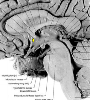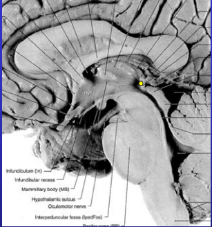 Posterior commissure; really part of the brainstem, crossing over of pretectal neurons involved in pupillary (consensual) light reflexes, located ventral to pinneal gland