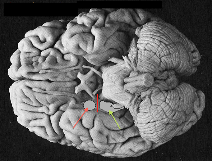 deep to the uncus lies the amygdala (anteriorly, pink arrow) and hippocampus (posteriorly, green arrow)