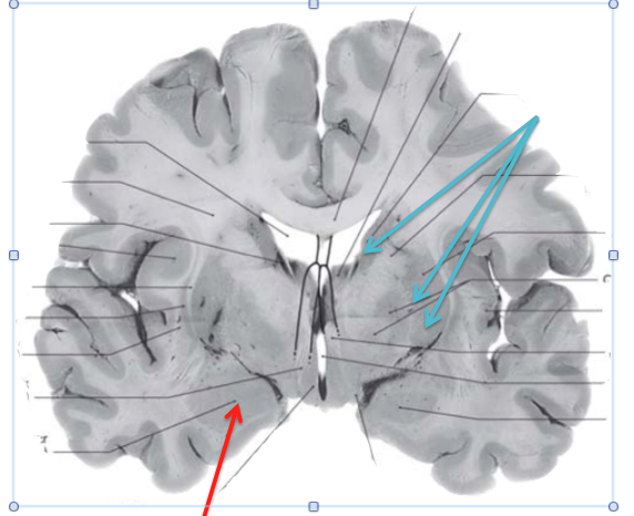 Red arrow: Amygdala, which is located in same coronal plane as the Basal ganglia (blue arrows)