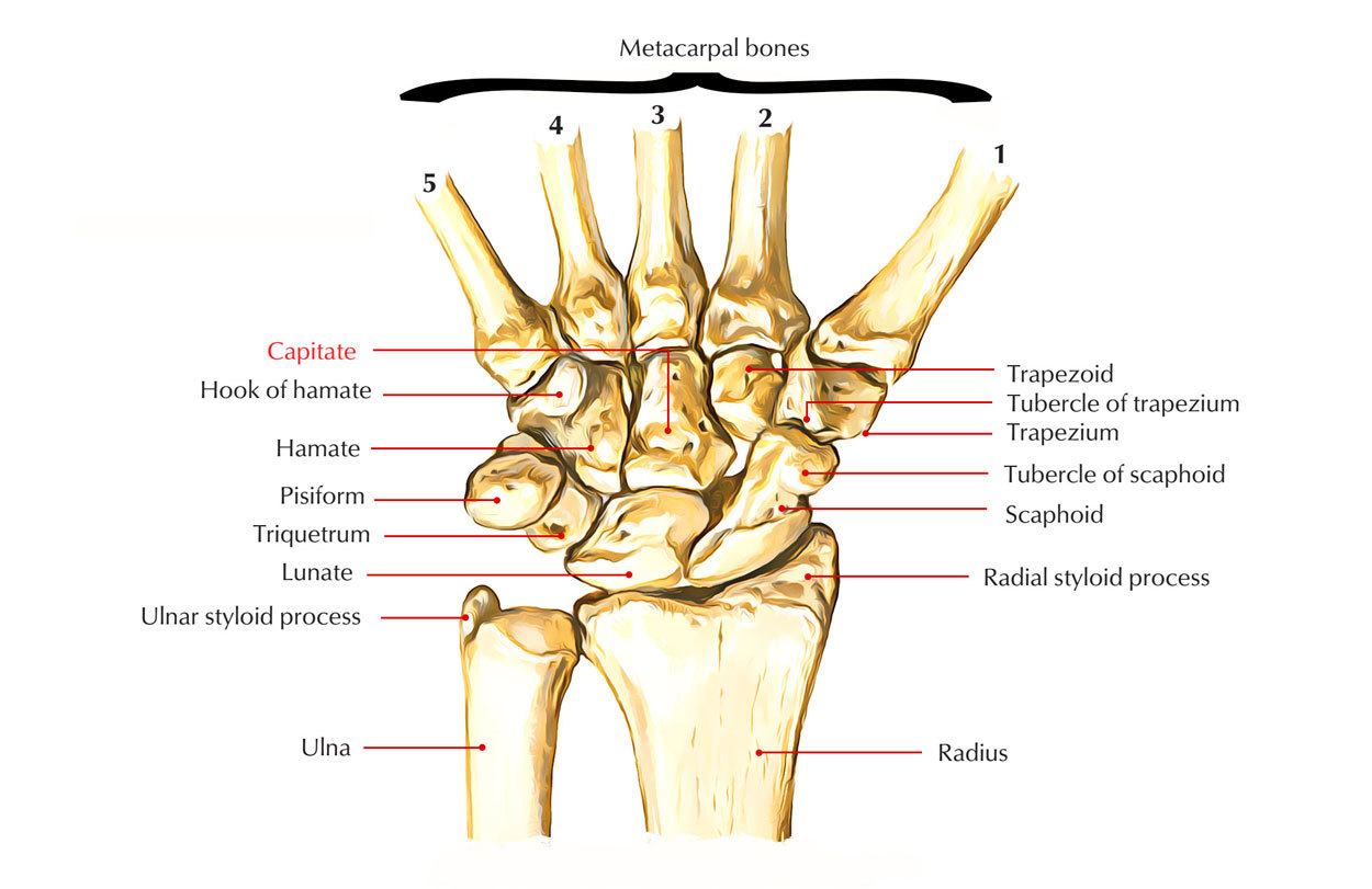 This is the largest of the carpal bones. It is centrally placed with a rounded head set into the cavities of the lunate and scaphoid bones. Flatter articular surfaces are present for the hamate medially and the trapezoid laterally. Distally the bone articulates predominantly with the middle metacarpal.