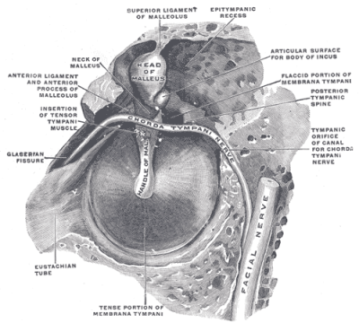 The chorda tympani runs medially to the pars flaccida. The relationship is shown from the medial aspect in the dissection below.