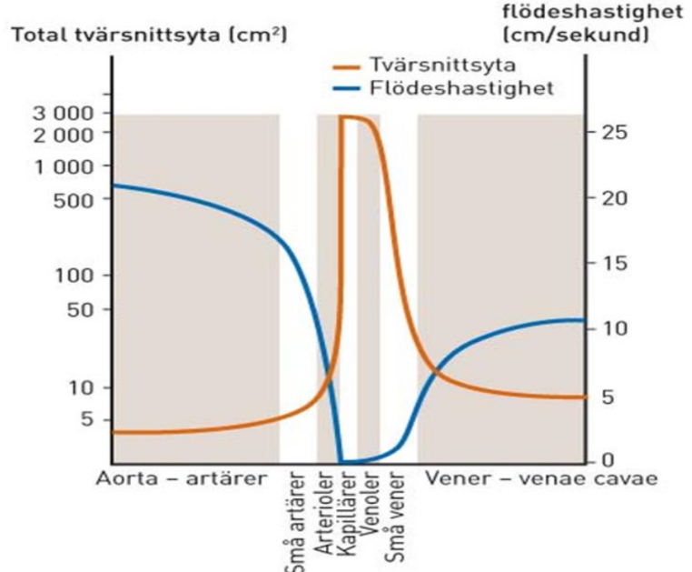 Förklara tvärsnittsytans förhållande i kärlen till flödeshastighet