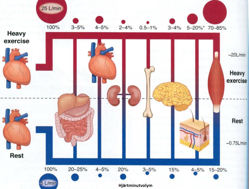 Till vilka organ omfördelas blodet framför allt vi maxträning och med hur mkt ökar det?